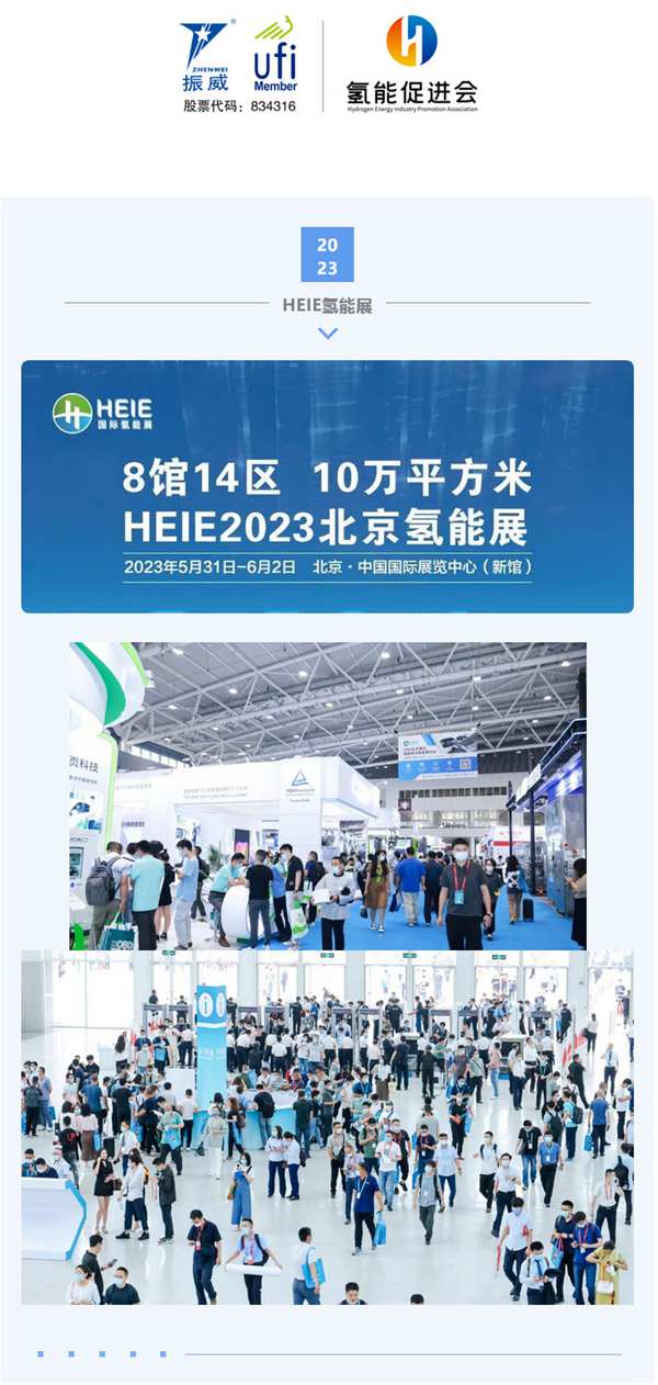 2023北京國際氫能技術(shù)裝備展覽會(簡稱:HEIE2023)由中國產(chǎn)業(yè)發(fā)展促進(jìn)會氫能分會和振威展覽集團(tuán)聯(lián)合主辦。將于5月31日-6月2日在北京•中國國際展覽中心(新館)舉行。展會設(shè)“8館14區(qū)”,總展覽面積10萬+平方米,預(yù)計參展企業(yè)1800余家,其中世界500強(qiáng)企業(yè)46家,國際展團(tuán)18個,參觀人數(shù)將達(dá)12.3萬人次。
