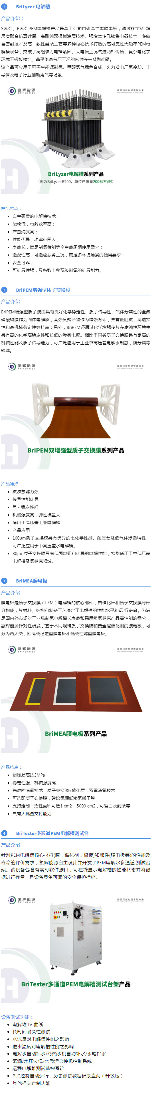 公司推出了以英文品牌 “BriHyNergy ”打造的具有強(qiáng)識別性PEM電解水制氫系列產(chǎn)品,包括:BriLyzer電解槽系列產(chǎn)品、BriPEM增強(qiáng)型質(zhì)子交換膜系列產(chǎn)品、BriMEA膜電極系列產(chǎn)品、BriTester多通道PEM電解槽測試臺架。