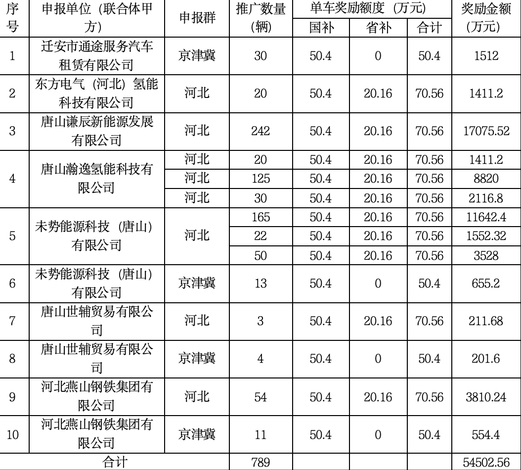 789輛氫車(chē)獲5.45億補(bǔ)貼!唐山第二年度燃料電池汽車(chē)獎(jiǎng)補(bǔ)資金分配計(jì)劃公示