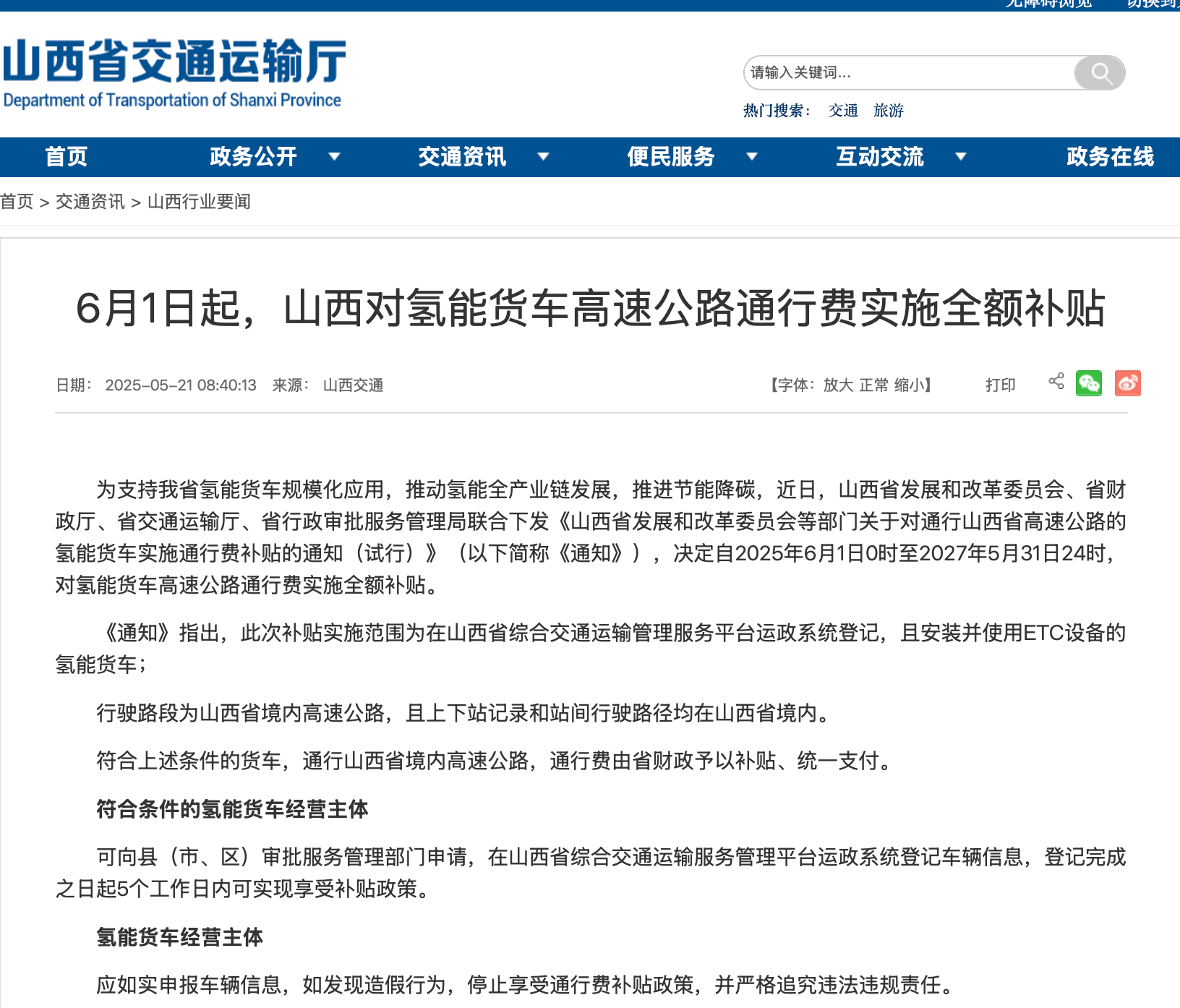5月21日,山西省重磅發(fā)布《關(guān)于對(duì)通行山西省高速公路的氫能貨車實(shí)施通行費(fèi)補(bǔ)貼的通知(試行)》(以下簡稱“《通知》”),明確自2025年6月1日起,全省高速公路將對(duì)符合條件的氫能貨車實(shí)施全額通行費(fèi)補(bǔ)貼,試點(diǎn)期暫定兩年。